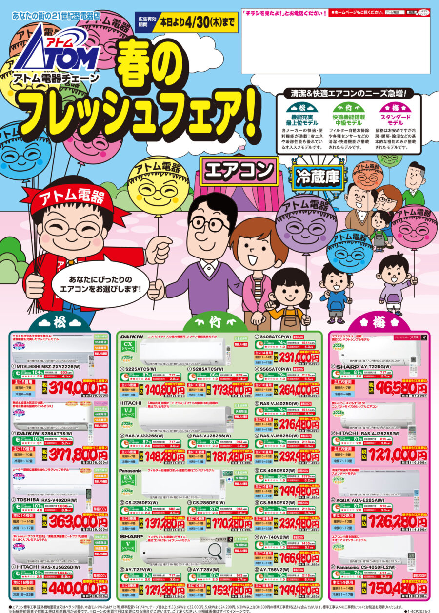 アトムチェーンでは新生活をむかえる方に向けて春のフレッシュフェアを絶賛開催中!新しい暮らしに必要な冷蔵庫・エアコンのおすすめ商品を多数ご用意してお待ちしております。