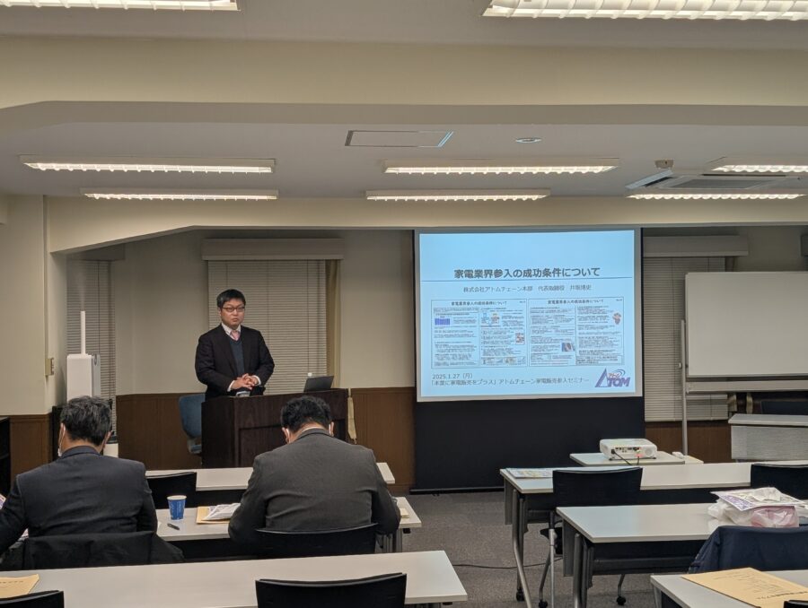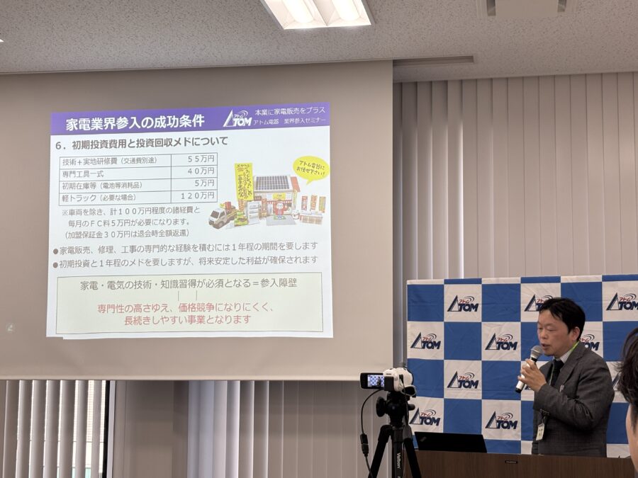 本業に加えて「もう1つの経営の柱」をご検討中の事業者様へ、家電販売を通じて本業との相乗効果を見込める「アトムチェーンの3大ノウハウ」「アトムチェーンの仕組み」「加盟店様の成功事例」などをお伝えする多彩な内容で開催いたしました。