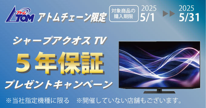 キャンペーン期間中にアトムチェーンで対象のシャープAQUOSをご購入いただくと通常1年の保証に+4年(合計5年)の延長保証をお付けいたします。