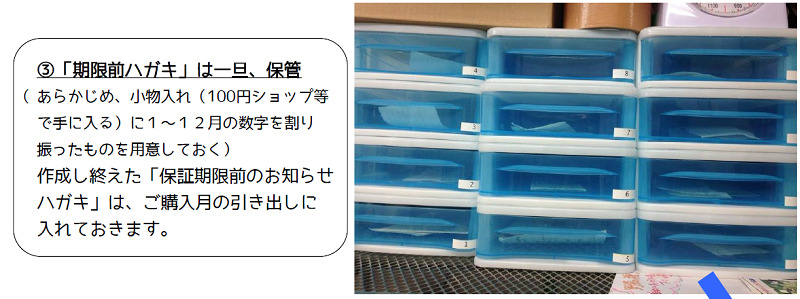 これは100円ショップ等で手に入るので3つ買うと100円×3×税で330円です。これに作成し終えた「保証期限前のお知らせハガキ」を、ご購入月の引き出し(例えば3月に買って頂いたとすると3の引出し)に入れておきます。