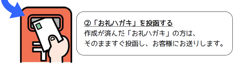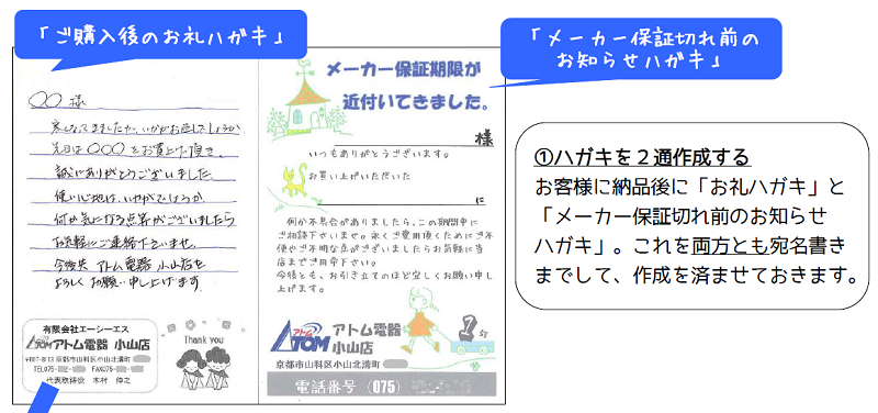 まず、商品をご購入していただいたら納品後に「お礼ハガキ」と「メーカー1年保証切れ前のお知らせハガキ」。これを2枚とも宛名書きまでして、作成を済ませてしまいます。