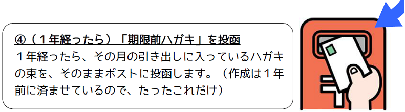 1年後のその月初めには、引き出しに1年前に入れた「お知らせハガキ」が束になって入っていますね。この束をそのまま投函すればいいのです。たったこれだけ。簡単、かつ間違いも少なそうです。