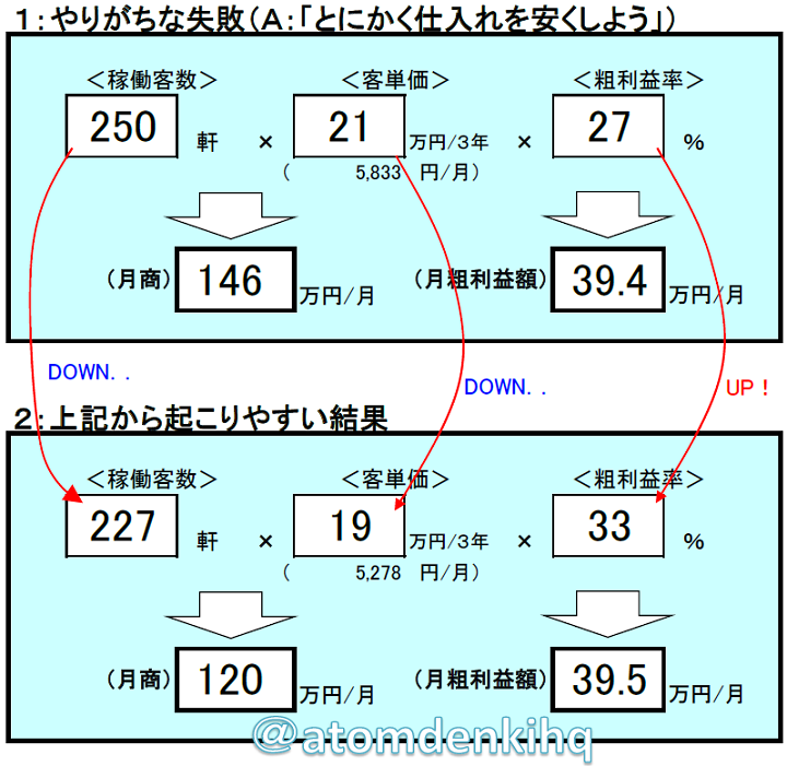 上記は粗利益額を大きくしよう、とやっていることですが、粗利益額は単品では確かに「売上-原価」ですが、月間粗利額はそれだけでは決まりません。町の電器屋さんが「売上を増やしたい」「粗利額を増やしたい」場合、3つの要素に分解して考えないと上手く行きません。