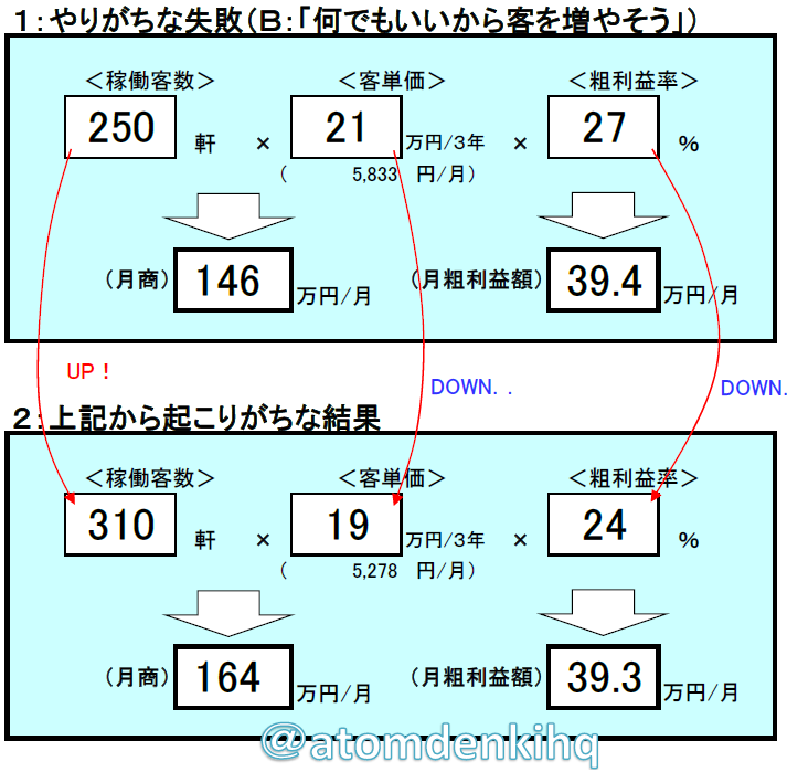 というこれまた簡単な計算です。しかし、新規集客はやり方を誤ると逆効果を生む怖さも併せ持っています。今から説明するのは短期間で顧客の大幅増を狙って失敗するパターン。(月間粗利益額)=(リピーター数)×(客単価)×(粗利益率)の公式に当てはめて考えてみます。