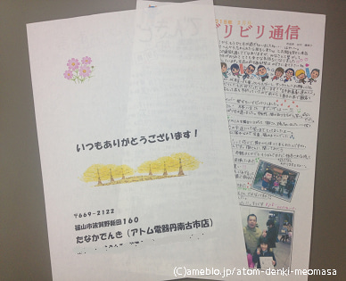 今は情報過多の時代ですから、何もしないでいるとお客様の気持ちがどんどん離れて行ってしまいます。アトム電器では毎月のアプローチを推奨していますが、その理由は失客の最大の理由が「忘れられてしまうこと」だからです。ただ漫然とチラシを投げ入れるだけじゃなく、こうした販促物やニュースレターを使ってお客様とお会いせずとも「対話」に持ち込めるかどうかというアプローチまで意識できると良いですね。