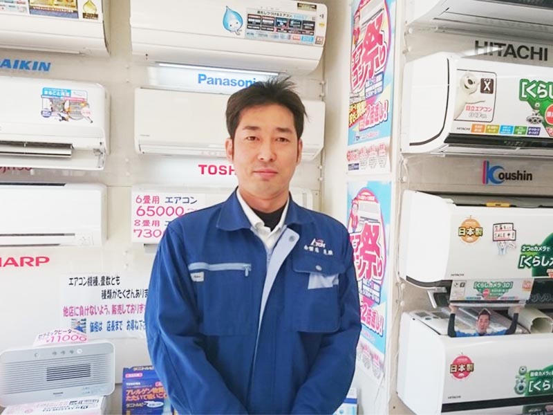 アトム電器に入ったきっかけは、まず国内全メーカー取扱いができるし、エアコンが特に安いので堂々と強みをアピールすることができる、これが一番でした。エアコン祭りの時につけるターポリン看板の写真を見て自分もしてみたいと思い加盟しました。加盟後、本部の⽅から経営相談支援を受け家電の売り上げも一気に上がりました。本部が毎月発行している家電特選品カタログと年間3回発行している住設・リフォームカタログもしっかり活用し、お客様からの注文、問い合わせも実際に増え、納品、工事と追われるようにまでなっています。昨今商品の調達が難しいとよく聞きますが、アトムではお客様へ提案する商品には全く困りません。アトムのノウハウ、仕入・販促・情報を毎月の社長会で収集、それに加えてメンバー店さん同士の交流で色んな事を学べ、モチベーションも高まり実績アップに繋がっています。